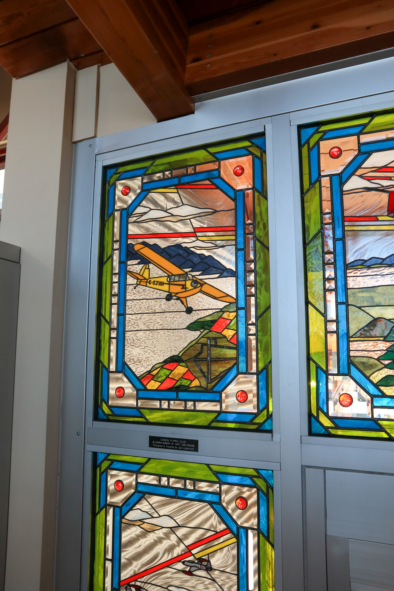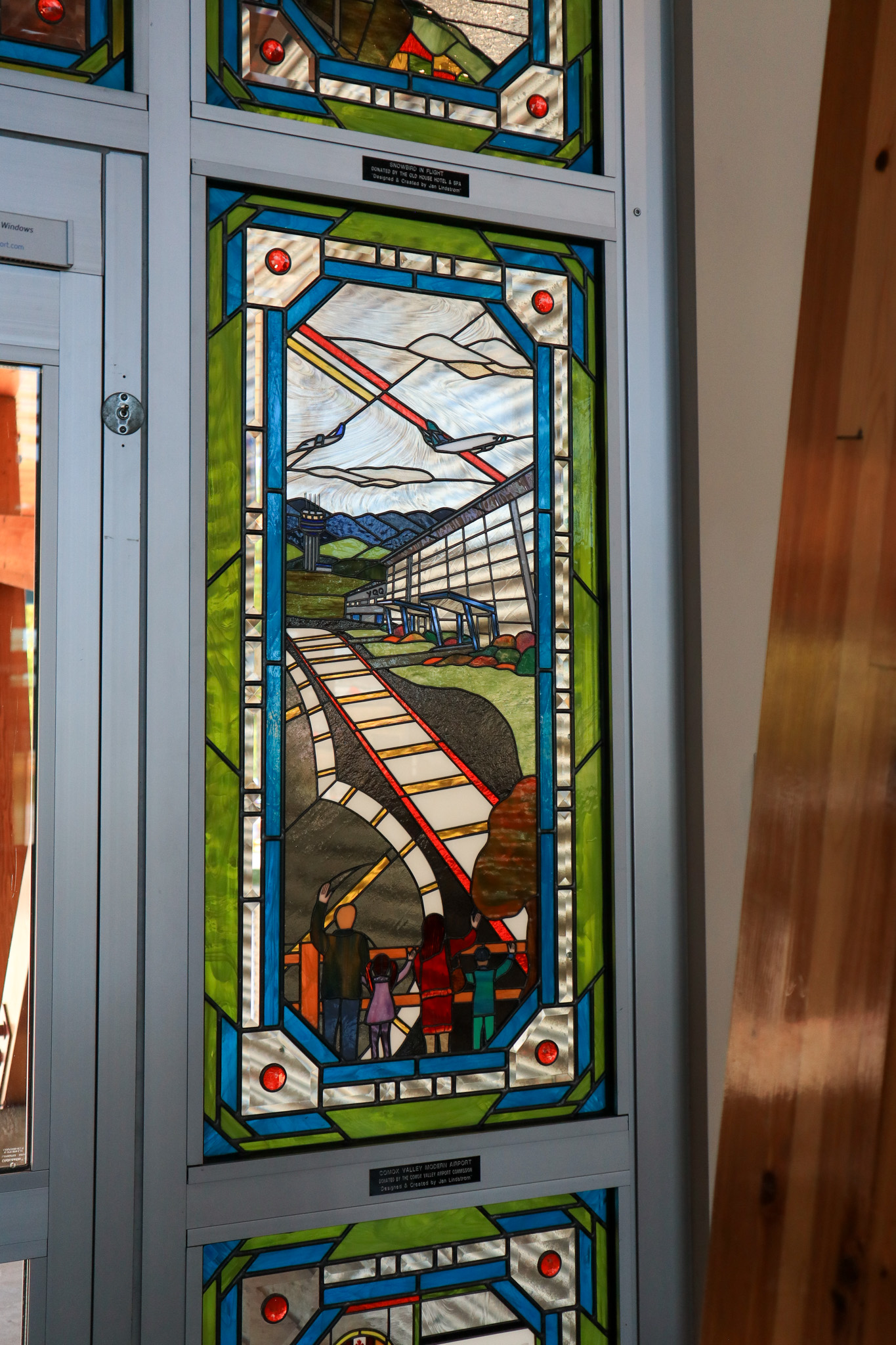 Travellers that come to the Comox Valley Airport are greeted by a stunning stained glass work of art by local reknowned artist, Jan Lindstrom. These are located at our centre entrance adjacent to gift shop & cafe, and our Arrivals doors.Quoted text below is from the artist Jan Lindstrom.