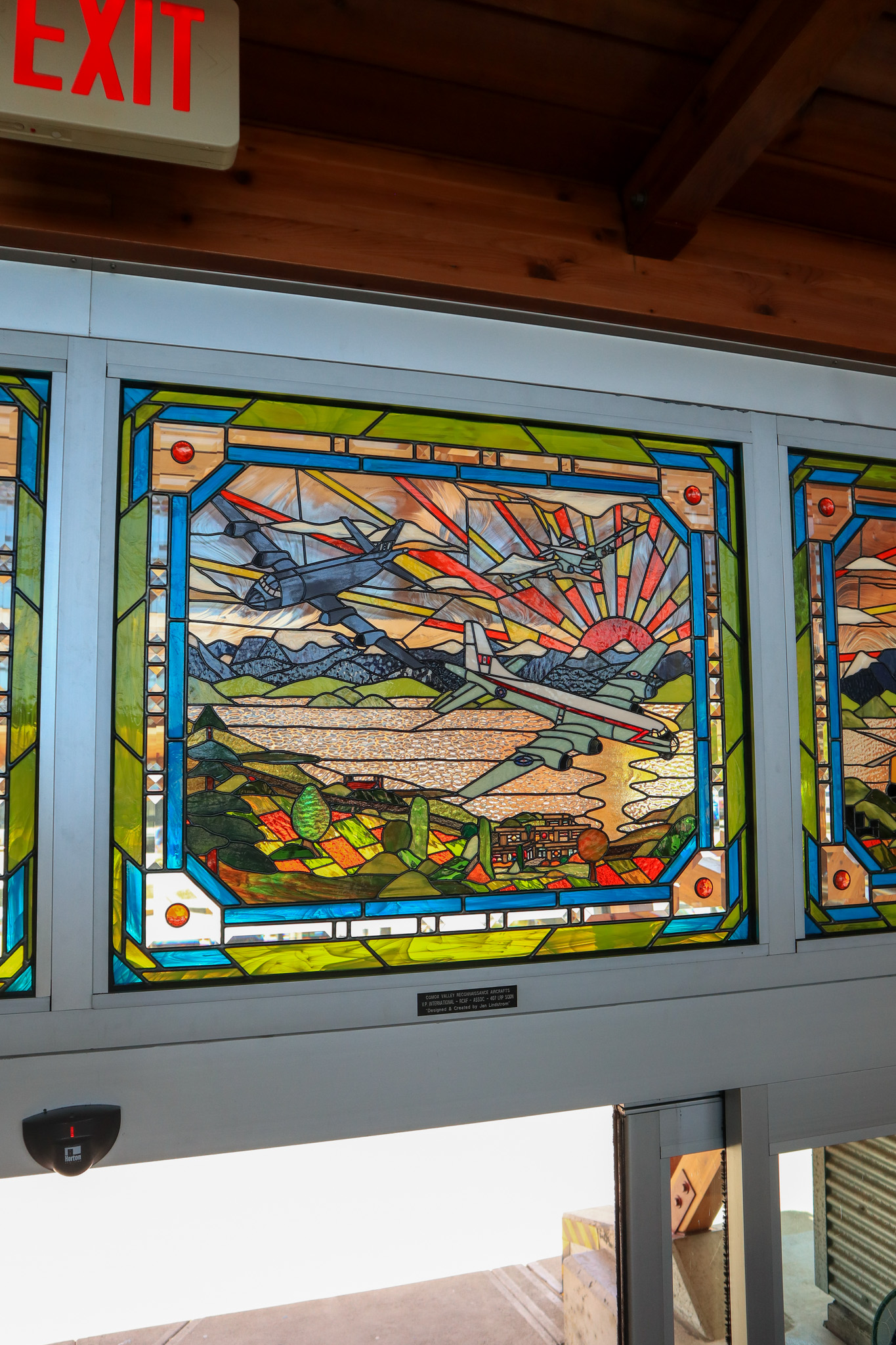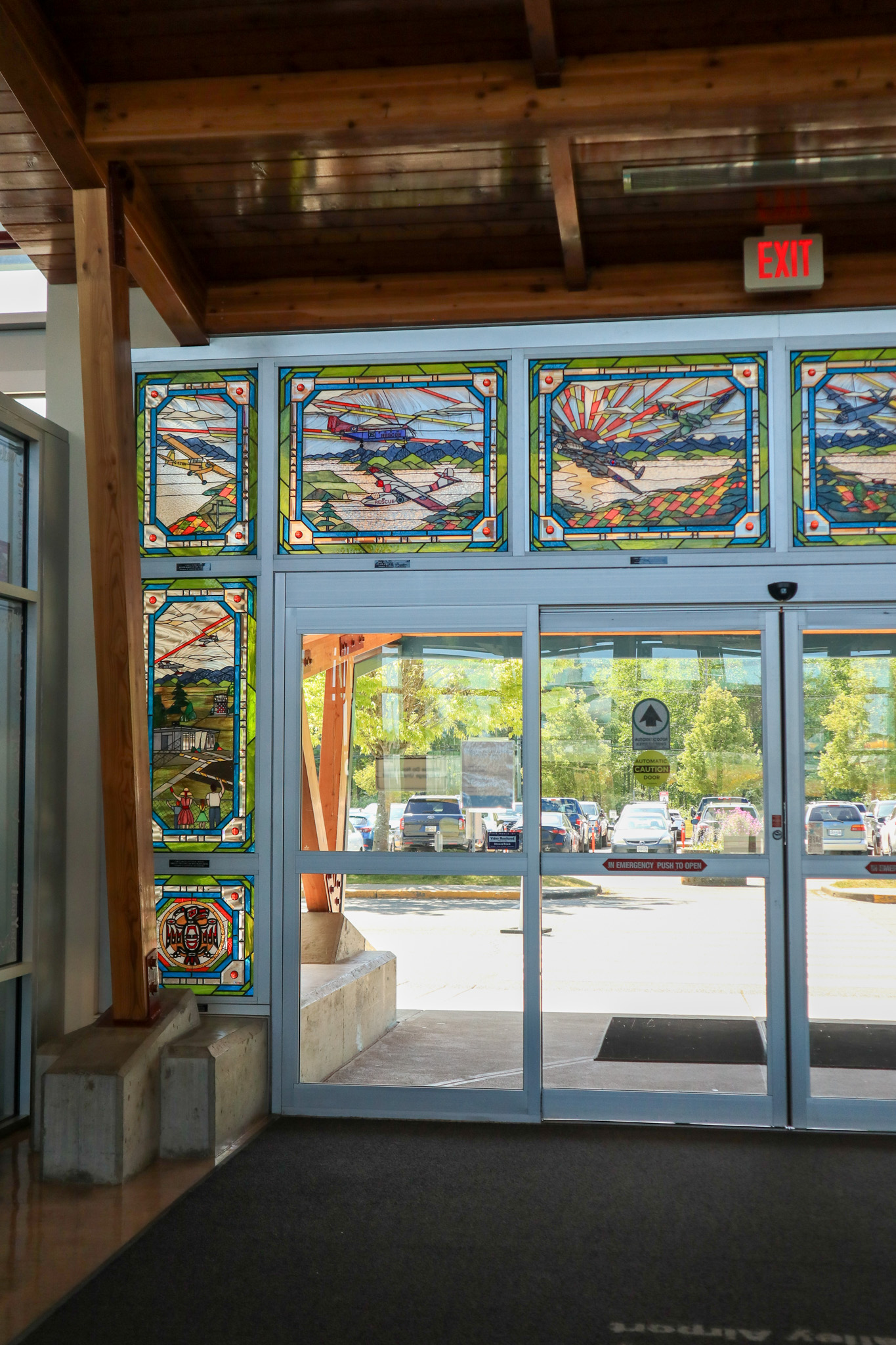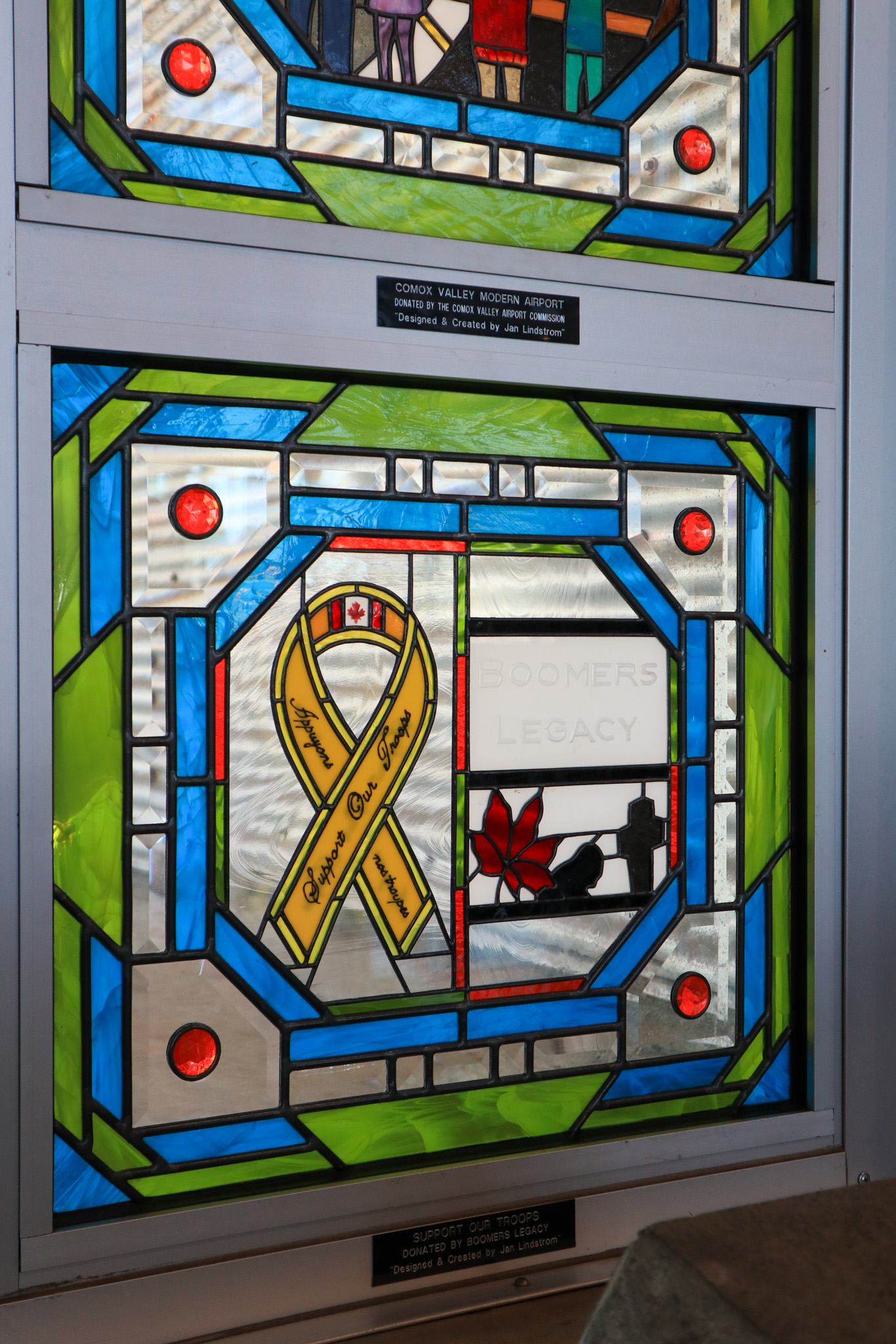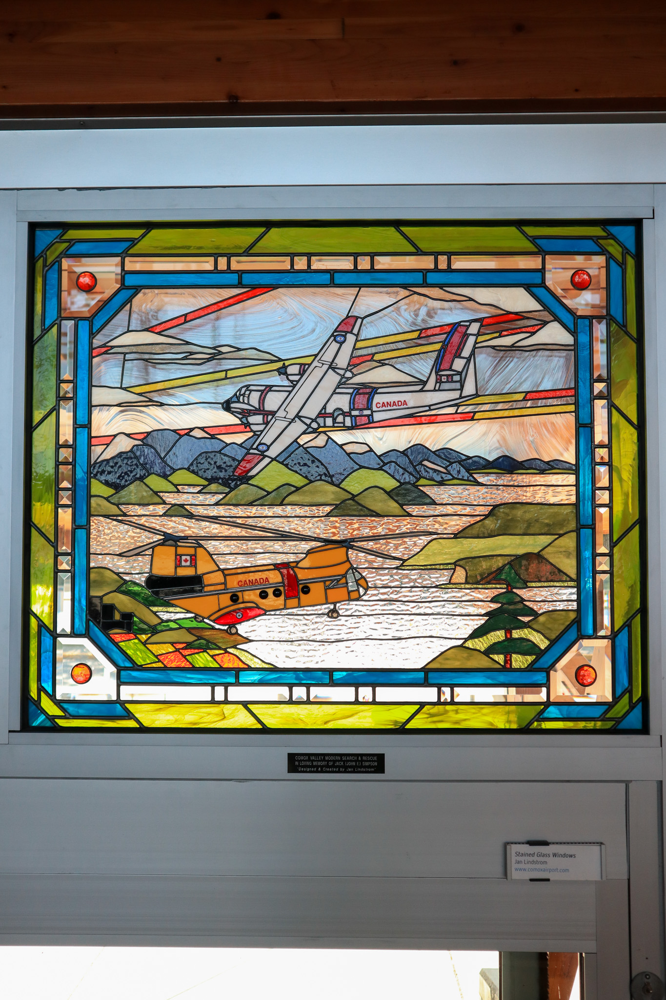 Travellers that come to the Comox Valley Airport are greeted by a stunning stained glass work of art by local reknowned artist, Jan Lindstrom. These are located at our centre entrance adjacent to gift shop & cafe, and our Arrivals doors.Quoted text below is from the artist Jan Lindstrom.