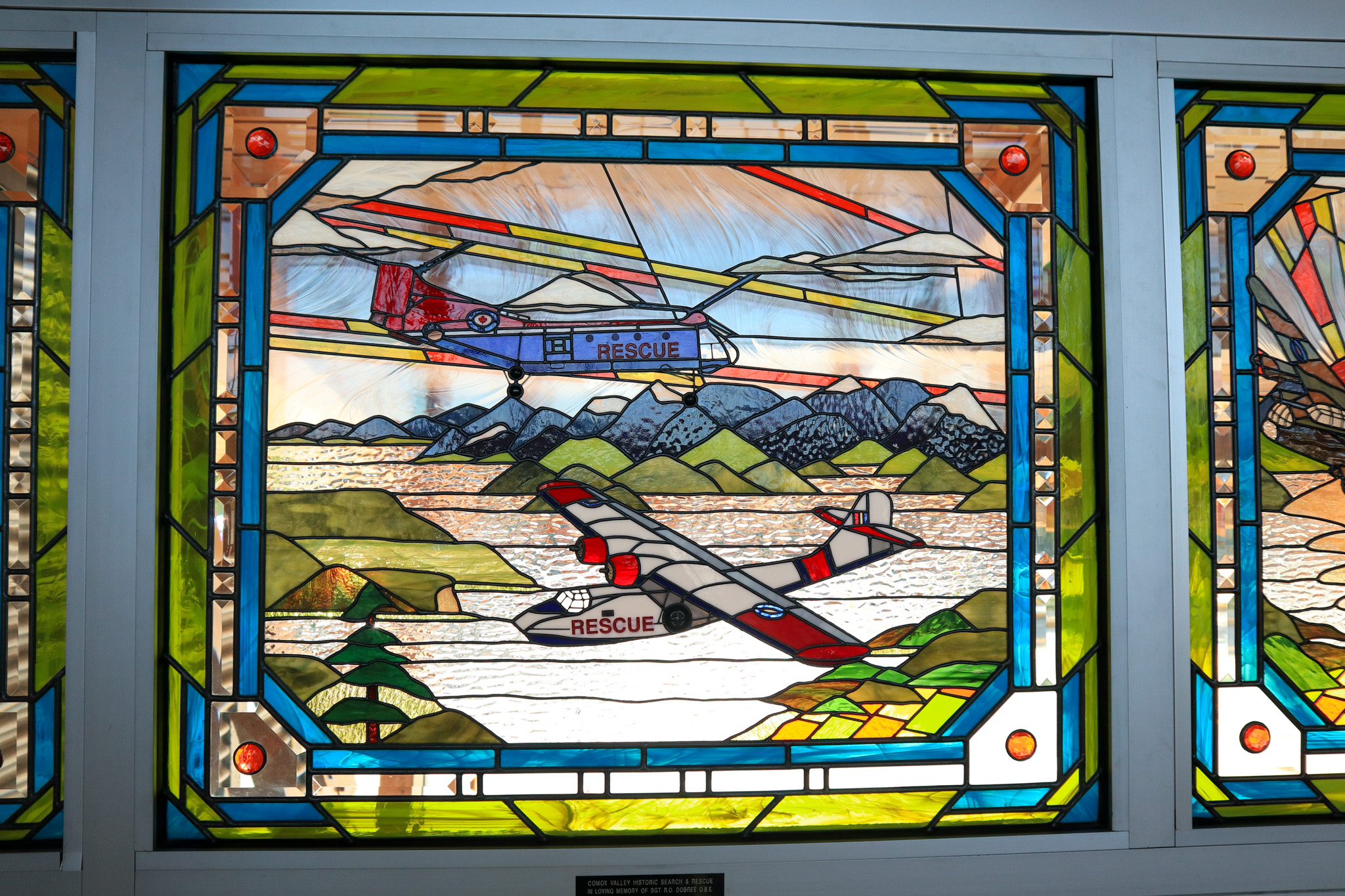 The second window on the right above the doors illustrates the Search and Rescue aircraft used from approx. 1960 to 2004, using the early colours of these airplanes. The lower one is the Labrador CH-113. By the 1990s the heavy use and hostile weather conditions of air-marine rescue were taking their toll on the Labrador fleet, resulting in increased maintenance costs and a replacement was required, which is the current Cormorant Ch-149. The upper aircraft is the Buffalo CC -115 which has extraordinary short takeoff and landing capabilities and is still being used today. This window was donated by Pauline Simpson, in honor of her husband and the artist’s father, Cpl. Jack Simpson, who worked on these aircraft from 1963 to 1969.