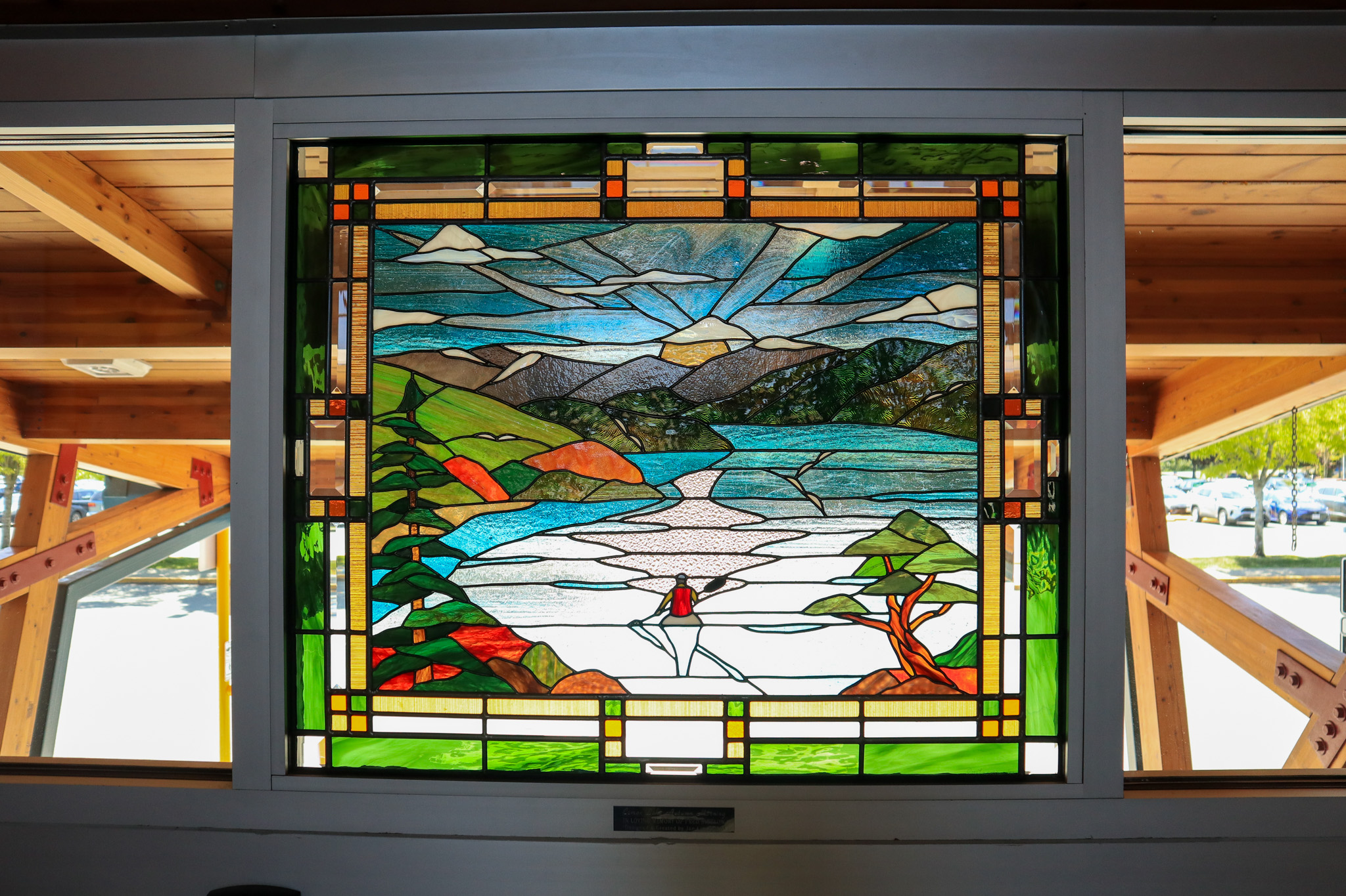 This stained glass window at Arrivals honours Fred Bigelow, former CVAC CEO and Royal Canadian Air Force veteran, who led YQQ with integrity and vision until his passing in 2021. The artwork reflects Fred's love of the Comox Valley's natural beauty and his dedication to community, service, and aviation. A lone figure travelling toward the mountains evokes his strength, humility, and enduring legacy. This tribute stands as a vibrant reminder of a leader who left a lasting imprint on the airport and region he cared deeply about.